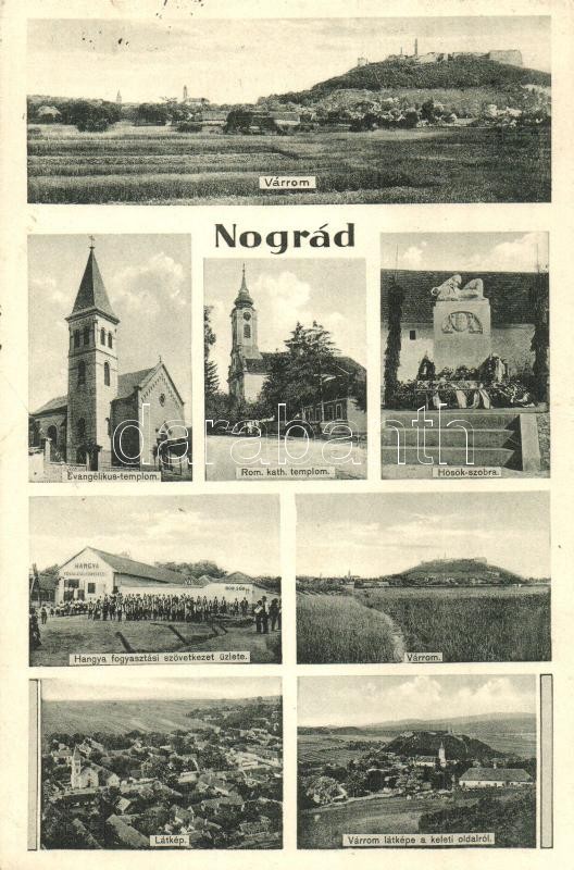 Leírás: Nógrád, Várrom, Evangélikus és római katolikus templomok, Hősök szobra, Hangya fogy. szövetkezet üzlete és saját kiadása