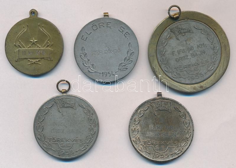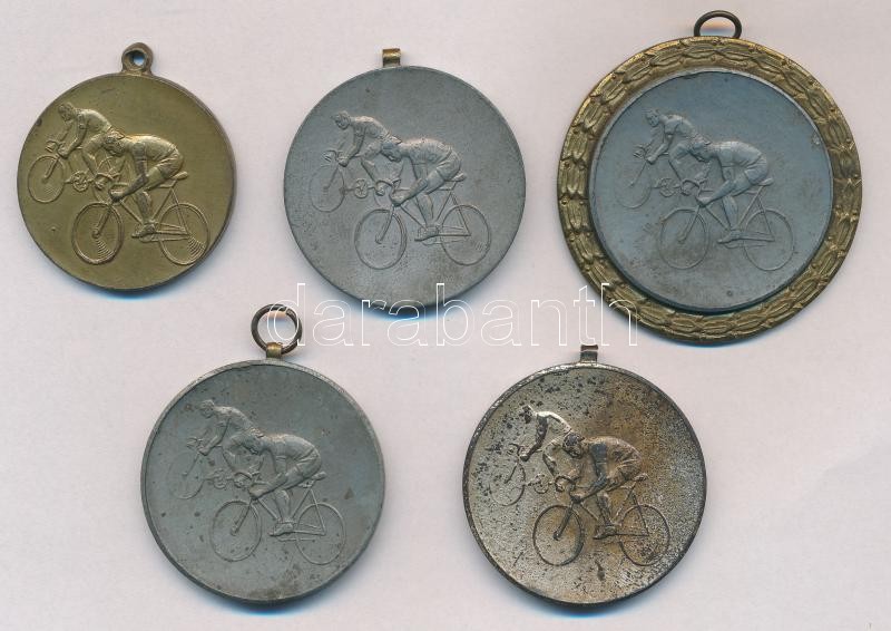 Leírás: ~1950. 5db klf kerékpáros díjérem, közte "Törekvés S.E." és "Előre S.E." T:2,2- aranyozás és ezüstözés kopott, patina