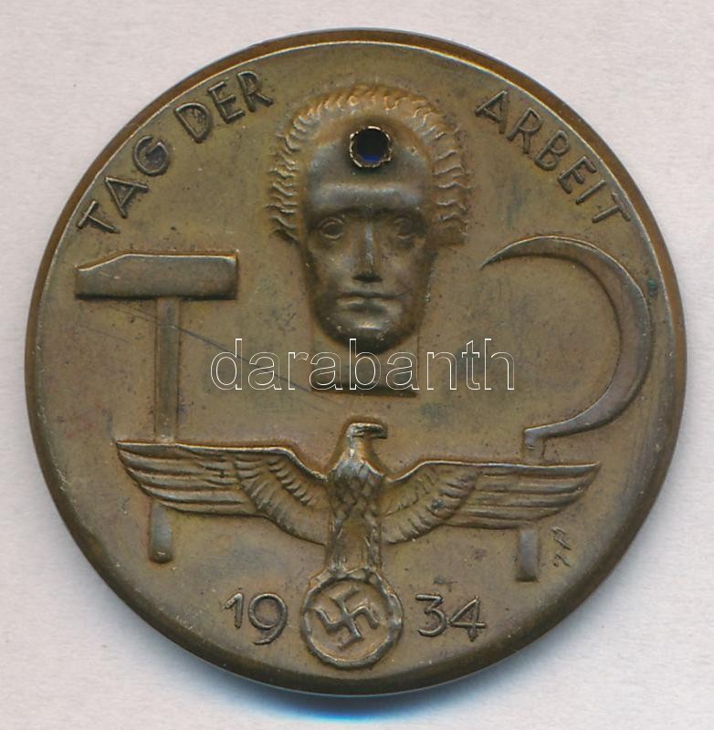 German Third Reich 1934. "Tag der Arbeit 1934" Cu badge with "REICHSVERBAND PFORZHEIM 47" makers mark on back (35mm) C:VF,F hole, missing pin