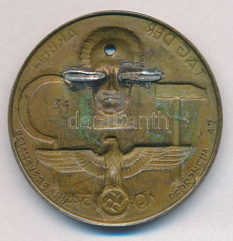 Német Harmadik Birodalom 1934. "A Munka Napja 1934" Cu jelvény, a hátoldalán "REICHSVERBAND PFORZHEIM 47" gyártói jelzéssel (35mm) T:2-,3 ly. tű hiányzik