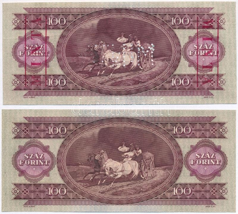 1968. 100Ft "B000 000989" sorozat és sorszámmal illetve piros "MINTA" felülnyomással és perforációval, nyomdai papírránccal + 1968. 100Ft piros festékfoltok T:I / Hungary 1968. 100 Forint with "B000 000989" serial number and with red "MINTA(SPECIMEN)" overprint and perforation and printig creases + 1968. 100 Forint red paint stains C:UNC Adamo F32Ma,F32