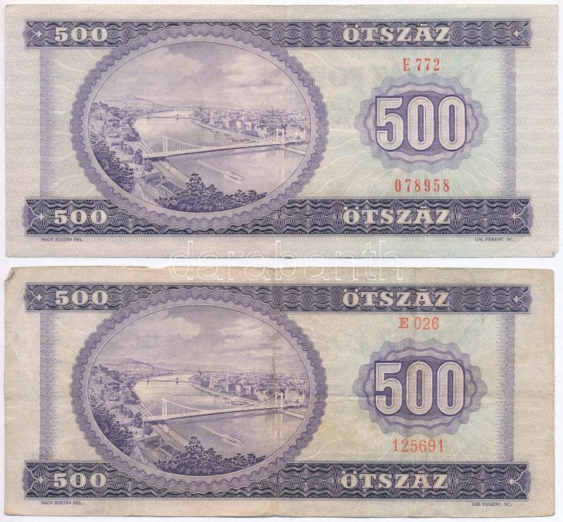 1969-1975. 500Ft (2x) T:III https://www.darabanth.com/hu/300-Gyorsarveres/300.0/Numizmatika/Magyar-bankjegyek~500006/1969-1975-500Ft-2x-TIII~II1607250