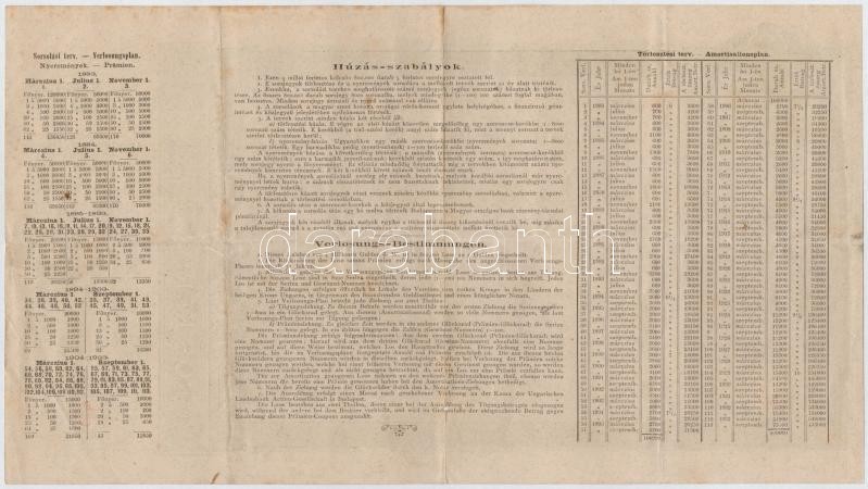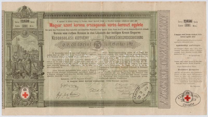 Leírás: Budapest 1882. "Magyar szent korona országainak vörös-kereszt egylete" kisorsolási kötvénye 5Ft értékben, bélyegzésekkel T:III,III- ly.