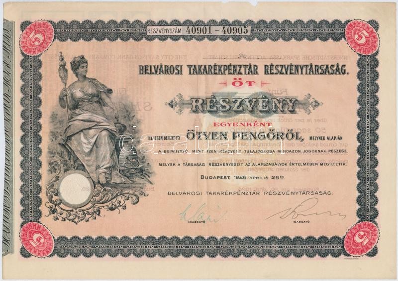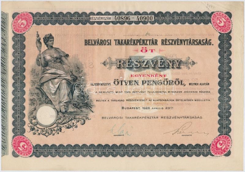 Budapest 1926. "Belvárosi Takarékpénztár Részvénytársaság" öt részvény... https://www.darabanth.com/hu/300-Gyorsarveres/300.0/Numizmatika/Reszvenyek-es-sorsjegyek~500019/Budapest-1926-Belvarosi-Takarekpenztar-Reszvenytarsasag-ot-reszvenye-egyben-250P-rol-~II1606715