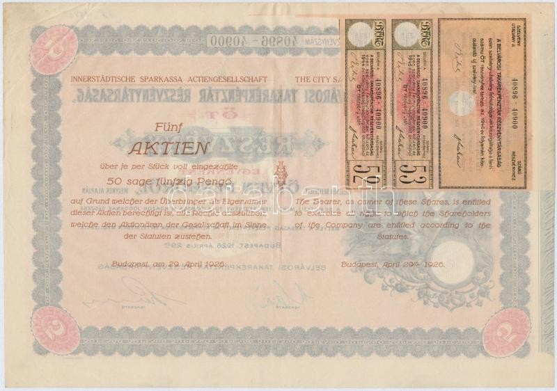 Leírás: Budapest 1926. "Belvárosi Takarékpénztár Részvénytársaság" öt részvénye egyben 250P-ről (2x), sorszámkövetők szárazpecséttel és szelvényekkel T:III