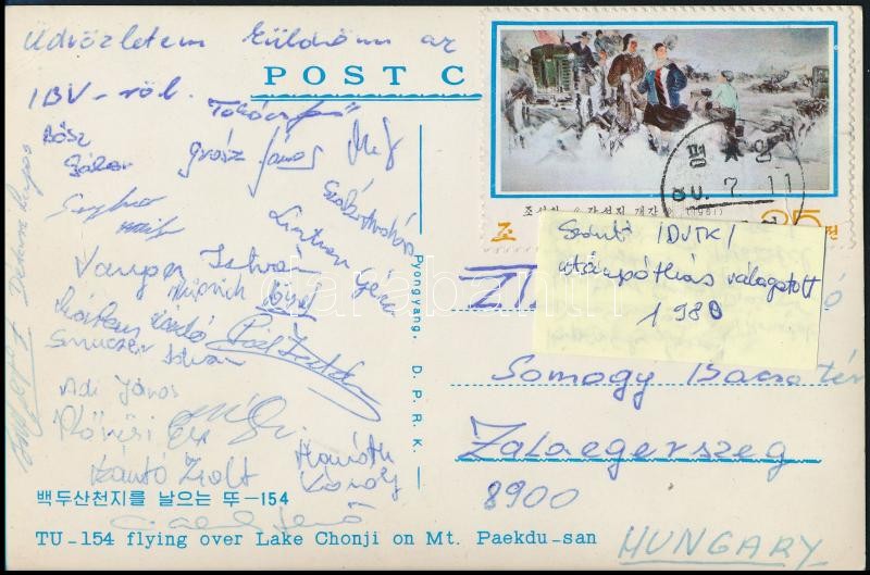 Leírás: 1980 a DVTK utánpótlás válogatott tagjainak (Grósz, Szántó, Márkus, stb.) Koreából küldött levelezőlapon