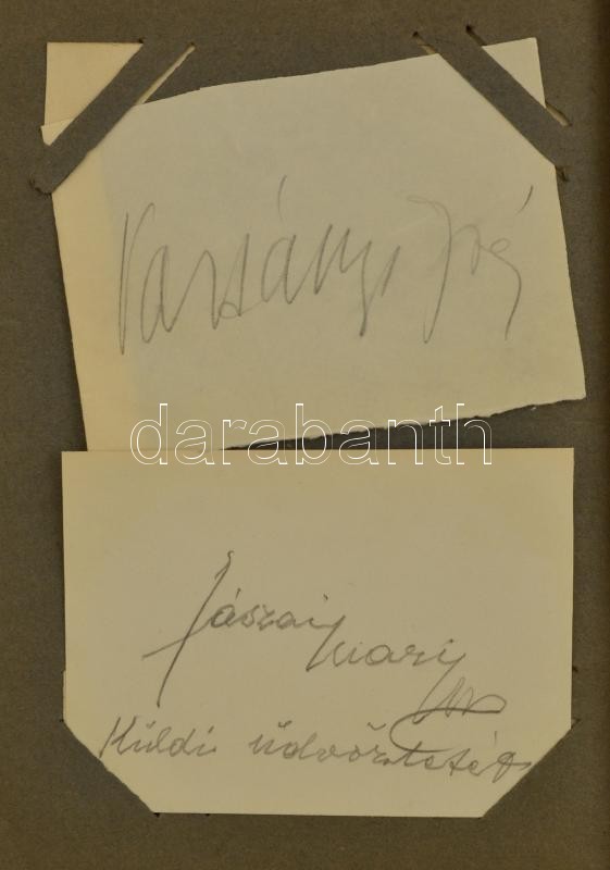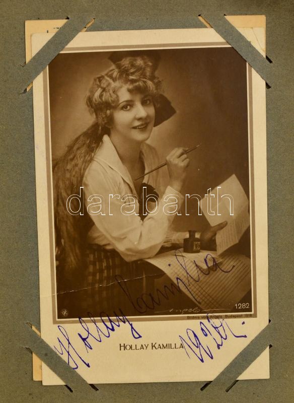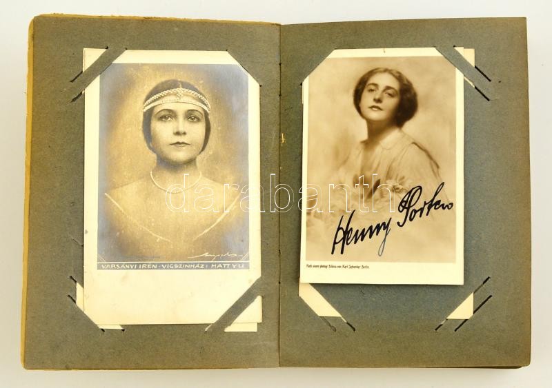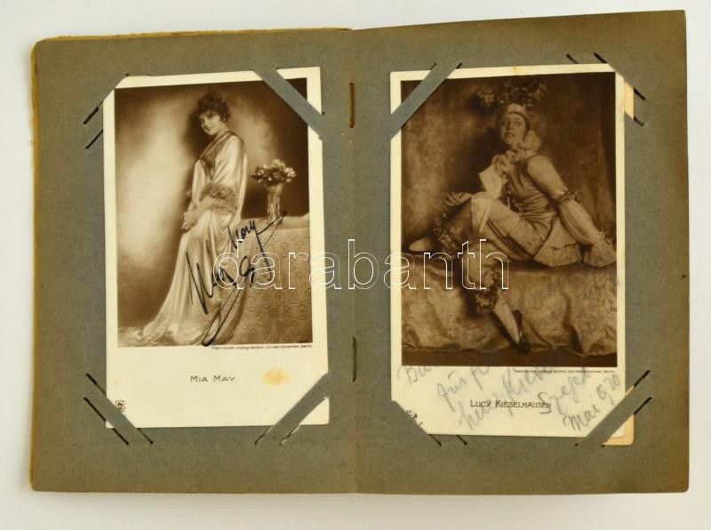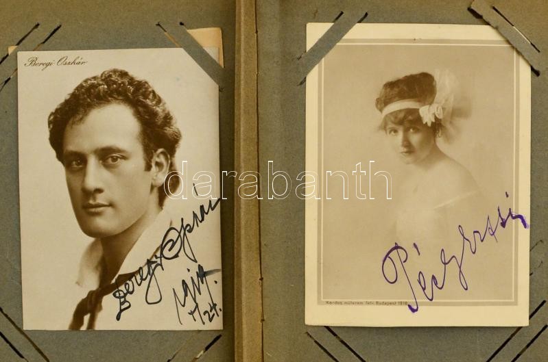 Nagy aláírásgyűjtemény, nagyrészt magyar hírességek, színészek, színésznők aláírásai fényképen vagy papírlapon: Ihász Aladár (1886-1960), Rajnai Gábor (1885-1961), Maria Jeritza (1887-1982), Beregi Oszkár (1876-1965), Jászai Mari (1850-1926), Darvas Lili (1902-1974), Bánhidy Ilona (1894-1974), Hollay Kamilla (1899-1967), Szécsi Ferkó (1913-1974), stb., albumba rendezve, összesen 71 db, köztük 51 db fénykép