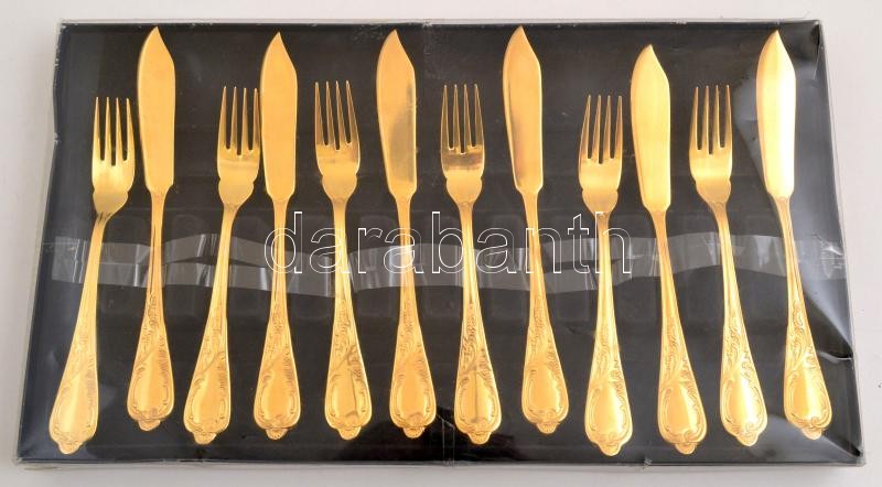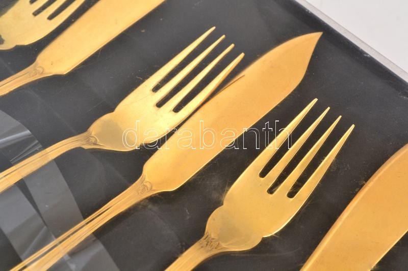 Leírás: 12 darabos halas étkészlet (halkés+villa), aranyozott, saját dobozában
