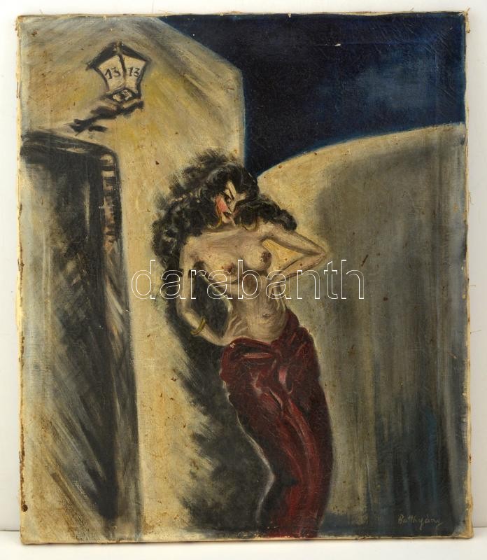 Leírás: Batthány jelzéssel: Éjszakai látomás. Olaj, vászon, sérült, 60×51 cm