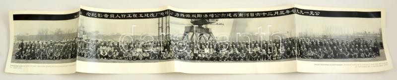 1997 Zhuang Hui (1963- ): A shuangyuani energiaszolgáltató társaság személyzete, kiállítási panorámafotó (Zeitgenössische Fotokunst aus Volksrepublik China, Neuer Berliner Kunstverein, 1997), felcsavarva, törésekkel, 16×97,5 cm / 1997 Zhuang Hui (1963- ): The staff of the energy supply company of Shuangyuan / Die Belegschaft der Energieversorgungsgesellschaft von Shuangyuan, panoramic photo from the exhibition Zeitgenössische Fotokunst aus Volksrepublik China (Neuer Berliner Kunstverein, 1997), rolled, with damages, 16×97,5 cm
