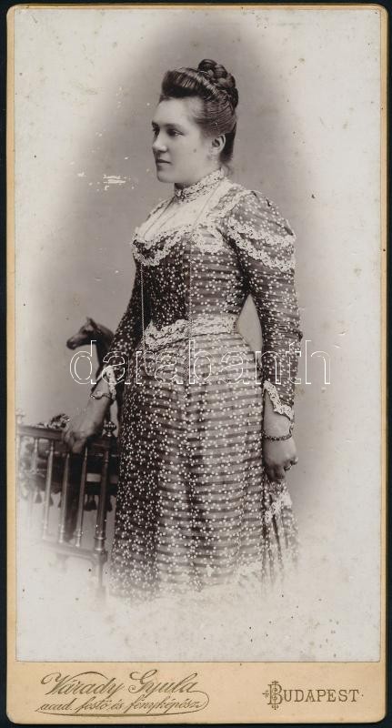 Leírás: cca 1900 Divatos hölgy, műtermi portréfotó Várady Gyula budapesti műterméből, 21x12 cm
