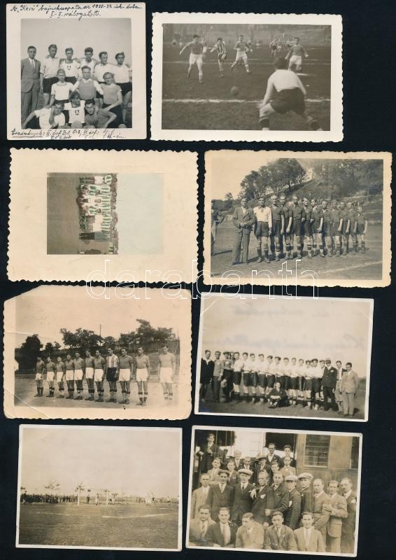 Leírás: cca 1929-1944 Futballról és futballcsapatokról készült fotók, 8 db, némelyik hátoldalon feliratozva, néhány sérülésekkel, 6x9 cm