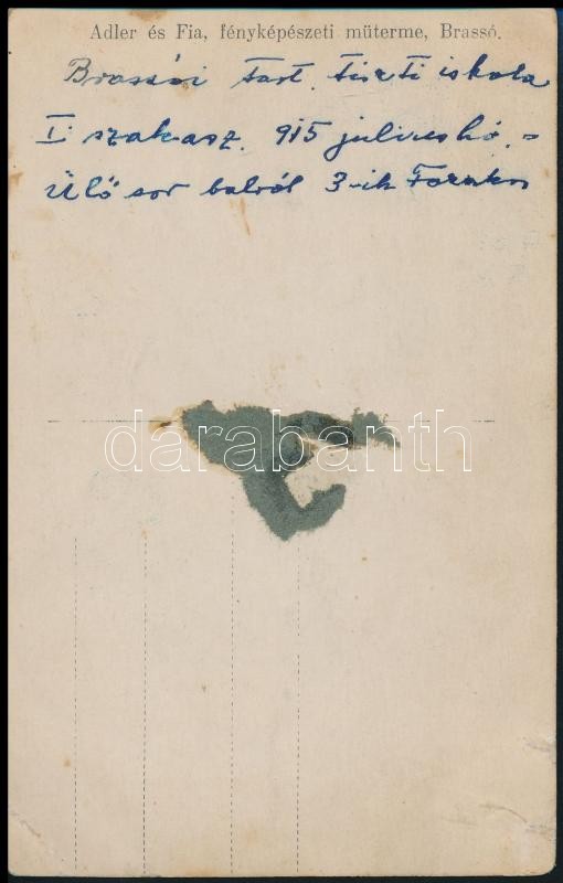 1915 A brassói tartalékos tiszti iskola I. szakasza, fotólap, hátoldal... https://www.darabanth.com/hu/301-Gyorsarveres/301.0/Festmeny-mutargy-papirregiseg-egyeb/Militaria~27/1915-A-brassoi-tartalekos-tiszti-iskola-I-szakasza-fotolap-hatoldalon-feliratozva-14x9-cm~II1615816