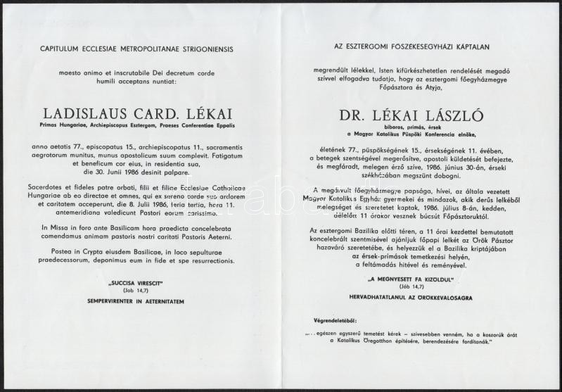 1986 Lékai László püspök halálozási értesítője https://www.darabanth.com/hu/301-Gyorsarveres/301.0/Festmeny-mutargy-papirregiseg-egyeb/Nyomtatvanyok~29/1986-Lekai-Laszlo-puspok-halalozasi-ertesitoje~II1619312