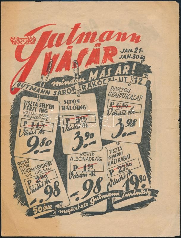 cca 1940 Bp. Rákóczi út, Gutmann és Társa vásári árlapja https://www.darabanth.com/hu/301-Gyorsarveres/301.0/Festmeny-mutargy-papirregiseg-egyeb/Nyomtatvanyok~29/cca-1940-Bp-Rakoczi-ut-Gutmann-es-Tarsa-vasari-arlapja~II1616800