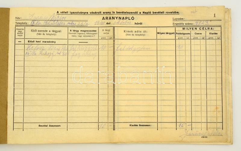 1940-1942 Fogász által használt kitöltött aranynapló https://www.darabanth.com/hu/301-Gyorsarveres/301.0/Festmeny-mutargy-papirregiseg-egyeb/Okmanyok~17/1940-1942-Fogasz-altal-hasznalt-kitoltott-aranynaplo~II1616987