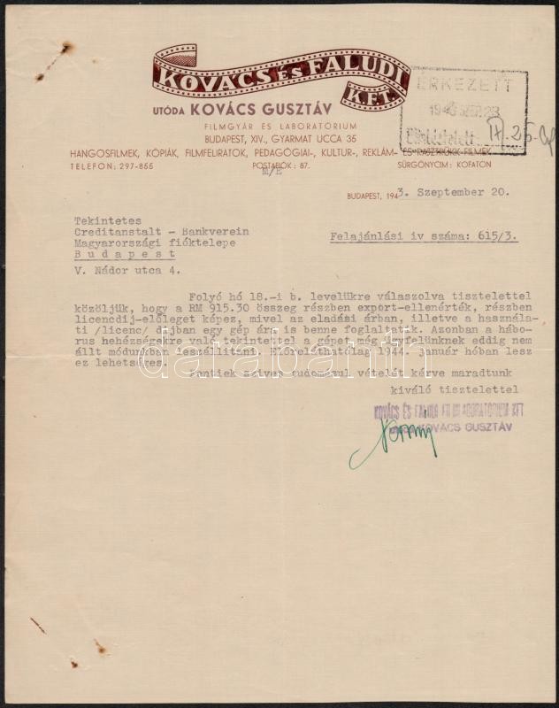 1943 Kovács és Faludi Kft. utóda Kovács Gusztáv filmgyár és laboratóri... https://www.darabanth.com/hu/301-Gyorsarveres/301.0/Festmeny-mutargy-papirregiseg-egyeb/Okmanyok~17/1943-Kovacs-es-Faludi-Kft-utoda-Kovacs-Gusztav-filmgyar-es-laboratorium-diszes-fejleces-s~II1618394