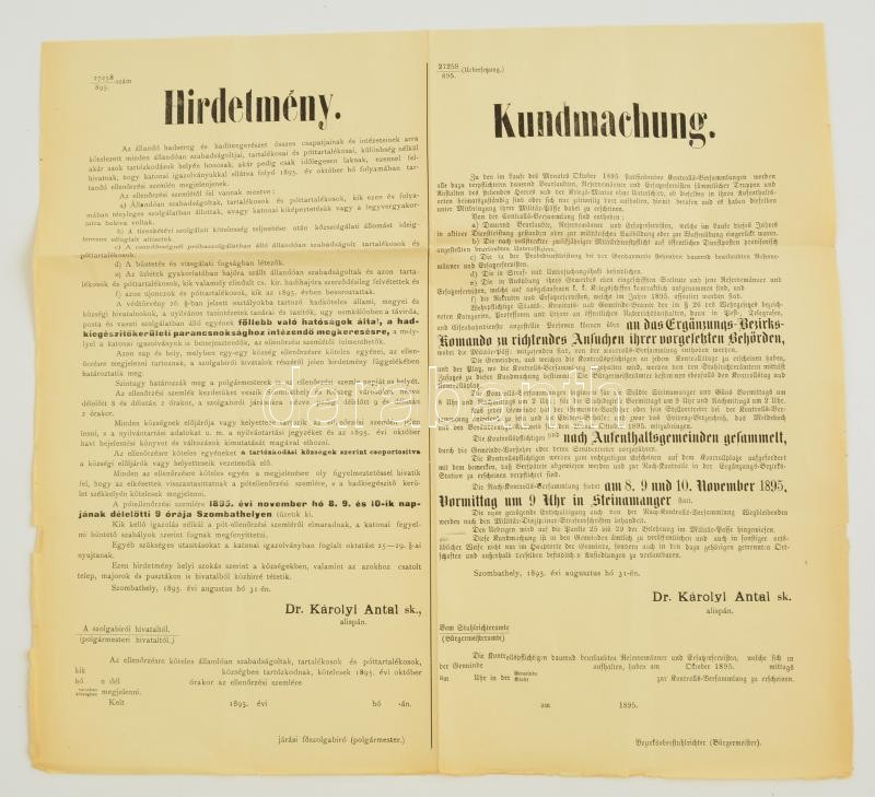 Leírás: 1895 Szombathely, Hirdetmény katonai ellenőrzési szemléről, kétnyelvű, 39x41,5 cm