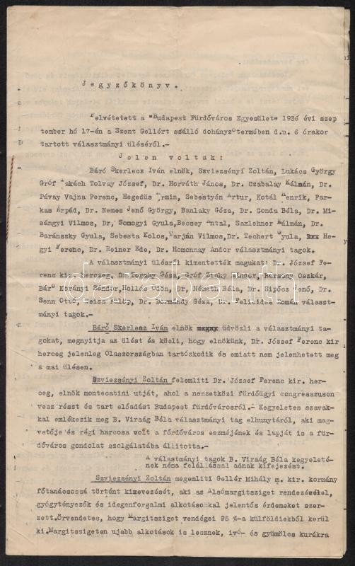 Leírás: 1936 Budapest Fürdőváros Egyesület választmányi üléséről készült jegyzőkönyv