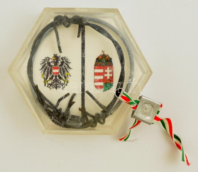 Leírás: 1989 A Magyar-Osztrák határon húzódó vasfüggöny egy darabja, magyar szalaggal, műanyag tokban, 9×9 cm