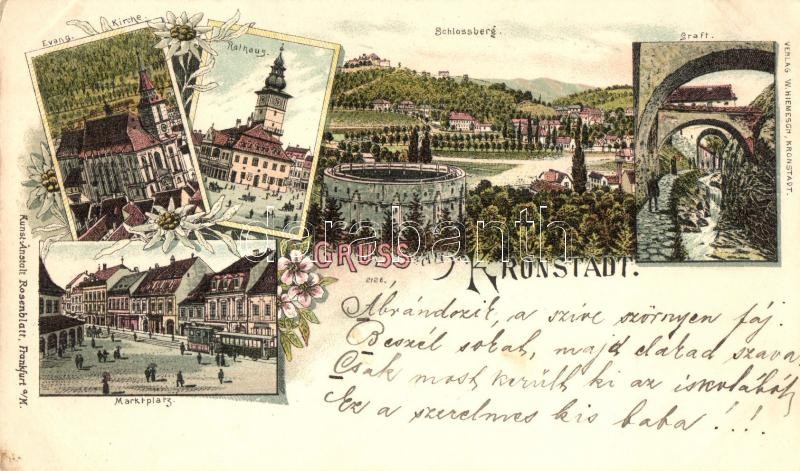 Brassó, Kronstadt, Brasov; Evang. Kirche, Rathaus, Marktplatz, Schlossberg, Graft. Verlag W. Hiemesch / Evangélikus templom, Városháza, Piactér, Fellegvár villasor, Graft-patak / church, city hall, market square, villas, river. Kunstanstalt Rosenblatt floral Art Nouveau litho (EK)