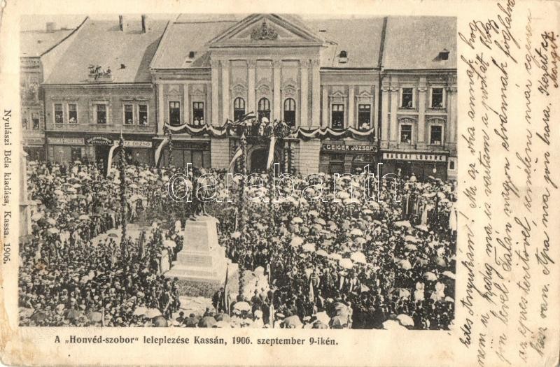 Leírás: Kassa, Kosice; A Honvéd-szobor leleplezése 1906. szeptember 9-én. Kassai szervezett munkások otthona, Melsner-Wiesenberg, Geiger József üzletei, Kassai Louvre. Nyulászi Béla kiadása / statue unveiling ceremony, workers' home, shops (kis szakadás / small tear)