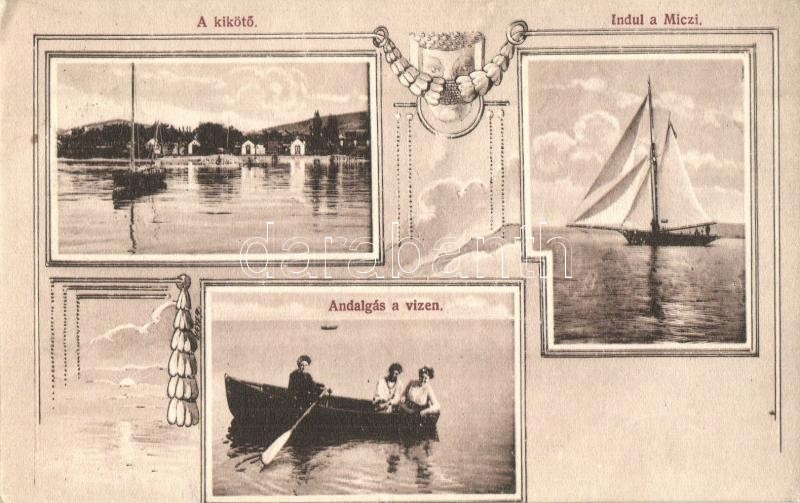 Leírás: Alsóörs, Kikötő, Miczi hajó, Andalgás a vízen. Divald Károly fia kiadása, Art Nouveau (EK)