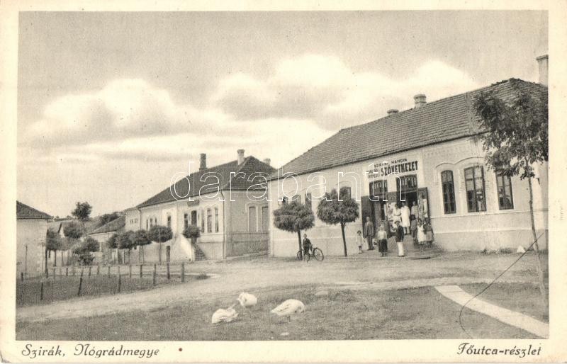 Leírás: Szirák, Fő utca, Hangya fogy. szövetkezet üzlete, kerékpár (EK)