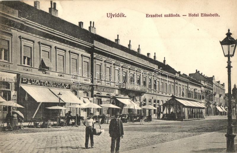 Újvidék, Novi Sad; Erzsébet szálloda, Löwy Mátyás és Társa, Svetozar Milovanovic, Obermüller és Társa üzletei, sörcsarnok, Urbán Ignác kiadása / hotel, shops, beer hall (b)