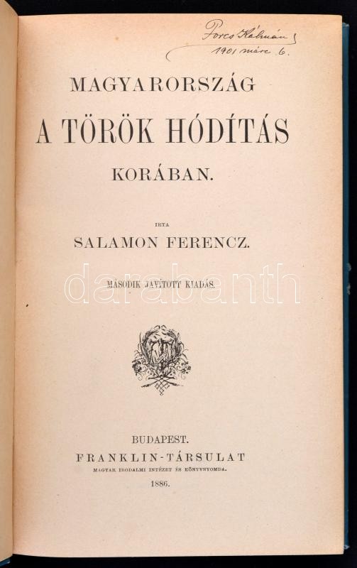 Salamon Ferenc: Magyarország a török hódítás korában. Bp., 1886, Franklin-társulat. Második, javított kiadás. Kiadói aranyozott egészvászon-kötés, Gottermayer N. kötésben. Jó állapotban.