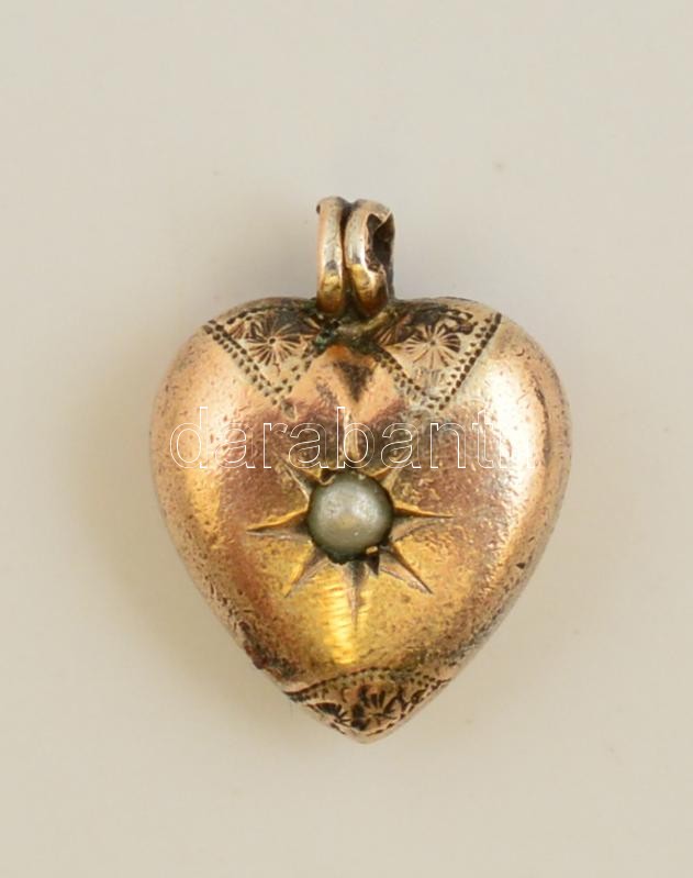 Leírás: Arany(Au) 14K szív alakú függő, gyöngy díszítéssel, kopásnyomokkal, jelzett, 1,3x1 cm, bruttó: 1 g