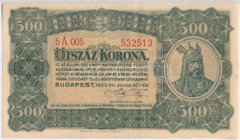 Leírás: 1923. 500K "Magyar Pénzjegynyomda Rt. Budapest" nyomdahely jelöléssel T:III szép papír