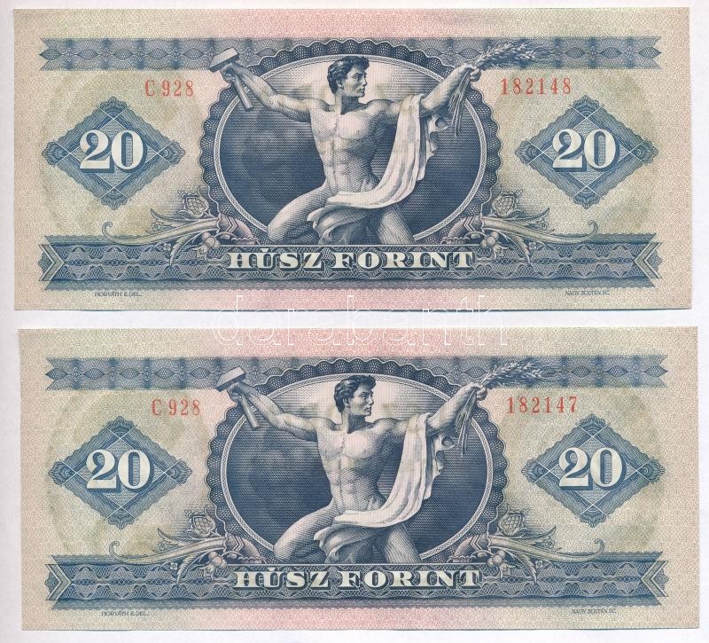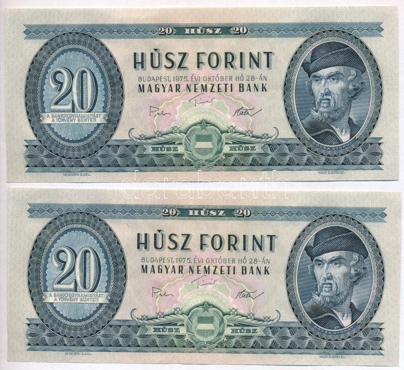 1975. 20Ft (2x) sorszámkövetők T:I https://www.darabanth.com/hu/301-Gyorsarveres/301.0/Numizmatika/Magyar-bankjegyek~300007/1975-20Ft-2x-sorszamkovetok-TI~II1618182