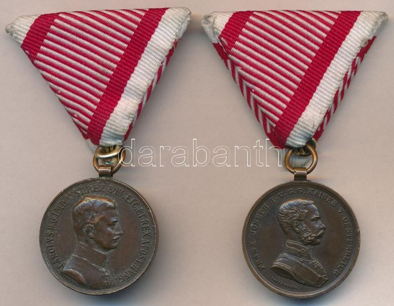 Leírás: 1914. "Ferenc József Bronz Vitézségi Érem" Br kitüntetés modern mellszalagon. Szign.: Tautenhayn + 1917. "Károly Bronz Vitézségi Érem" Br kitüntetés modern mellszalagon. Szign.: Kautsch T:2 kis ph.