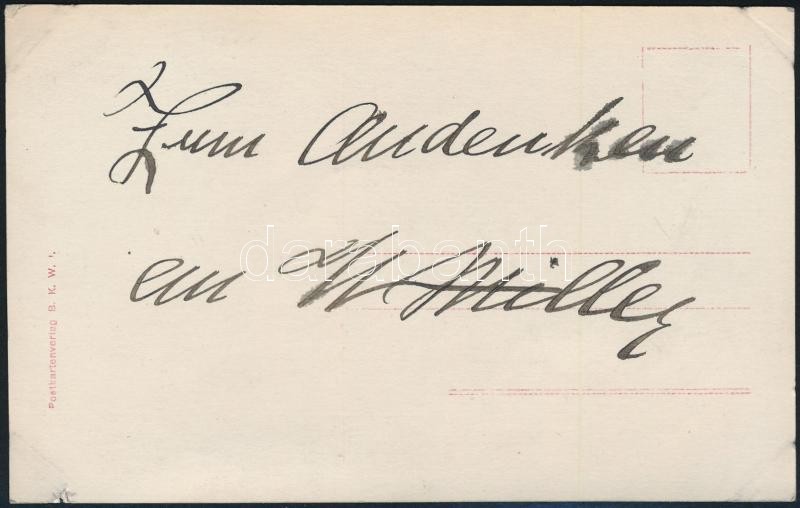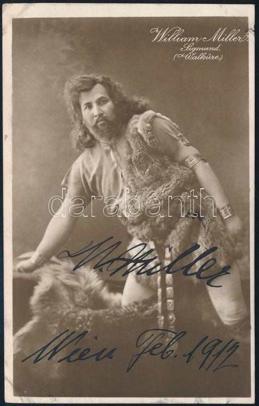 1912 William Miller operaénekes sajátkezű aláírása őt ábrázoló fotólapon, hátoldalán üdvözlettel megismételve / Autograph signature of William Miller opera singer