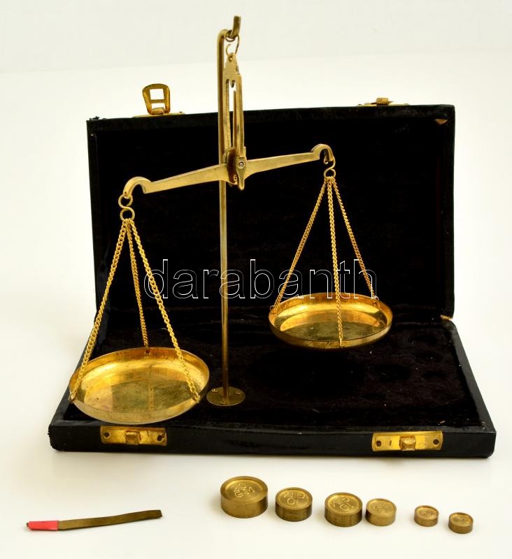 Leírás: Patikamérleg súlyokkal, saját dobozában