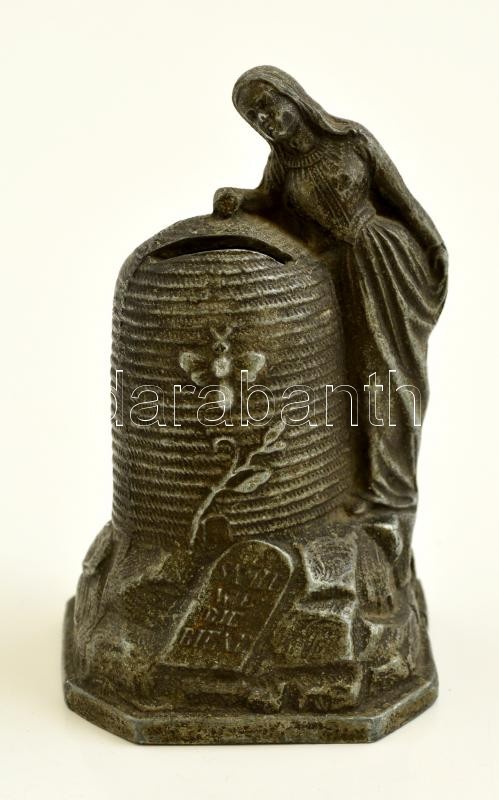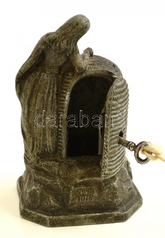 Leírás: Régi ón persely, kaptár és nőalak motívummal, zárral, kulccsal, m: 12 cm