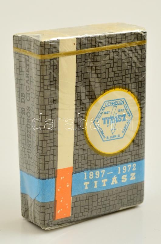 "Titász 1897-1972" bontatlan csomag cigaretta https://www.darabanth.com/hu/302-Gyorsarveres/302.0/Festmeny-mutargy-papirregiseg-egyeb/Bolhapiac~12/Titasz-1897-1972-bontatlan-csomag-cigaretta~II1614191