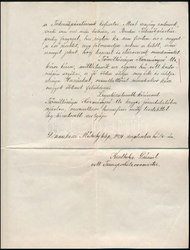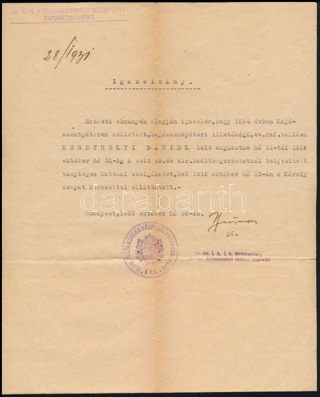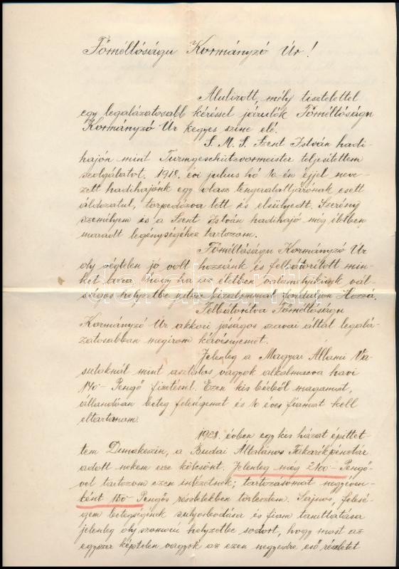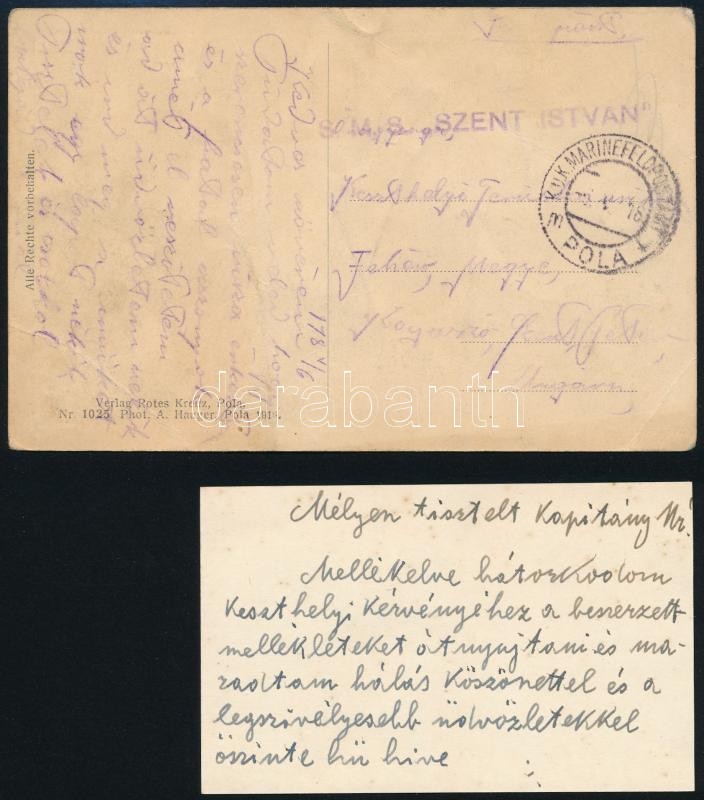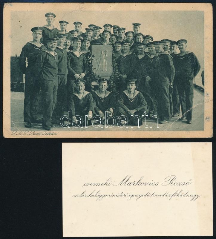 1931 Az S.M.S. Szent István hadihajón szolgált tüzérmester kérvénye Horthynak, hogy nehéz helyzetében segítsen rajta anyagilag. Hozzá a kérelmet elősegítő iratok, Markovics Rezső vadászfőhadnagy kézzel írott kártyája, valamint a Szent István hajó legénységét ábrázoló képeslap