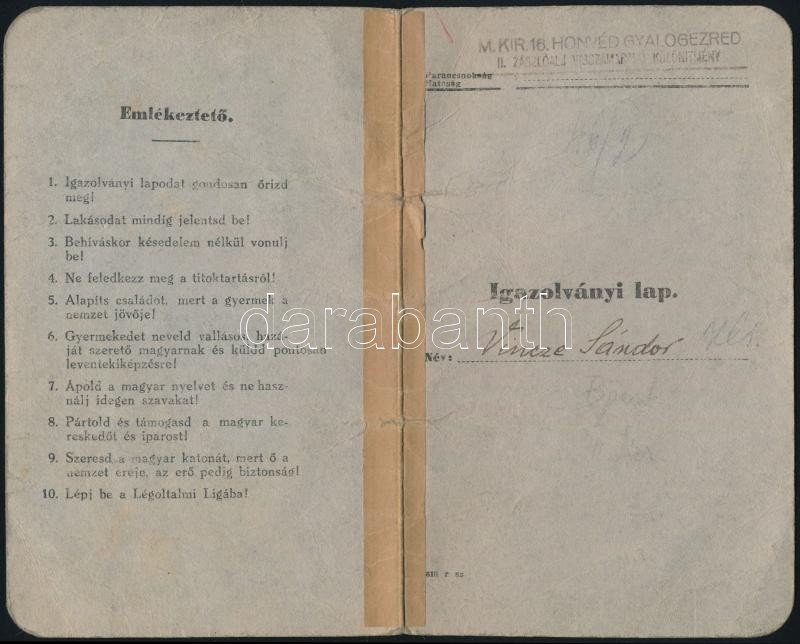 Leírás: 1938 Komárom, Igazolványi lap tartalékos gyalogsági katona részére, M. Kir. 16. Honvéd Gyalogezred