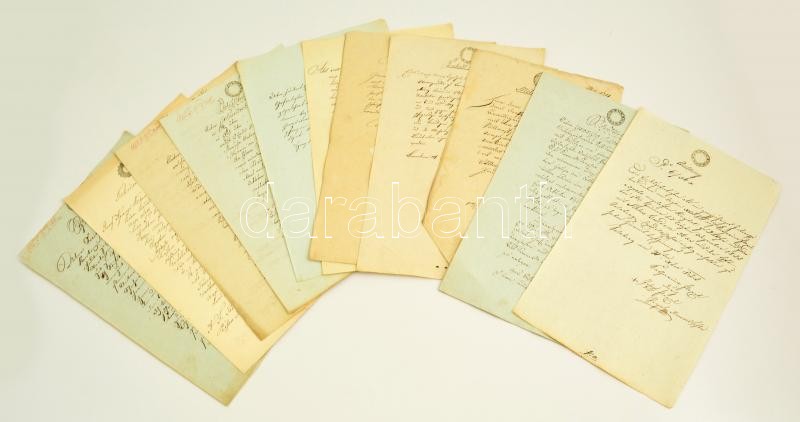 1822-1854 11 db Régi okmány, magyar és német nyelven, aláírásokkal, négyen szárazpecsétekkel,2 db 3 kr., 4 db 6 kr., 4 db 15 kr., 1 db 1 guldenes szignettával. Jó állapotban.