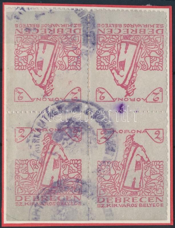 Leírás: 1919 Debrecen SZ.KIR.V. 1 sz. okirati illetékbélyege vastagabb papíron, függőleges egymással szembeforduló pár négyestömbben (22.750)