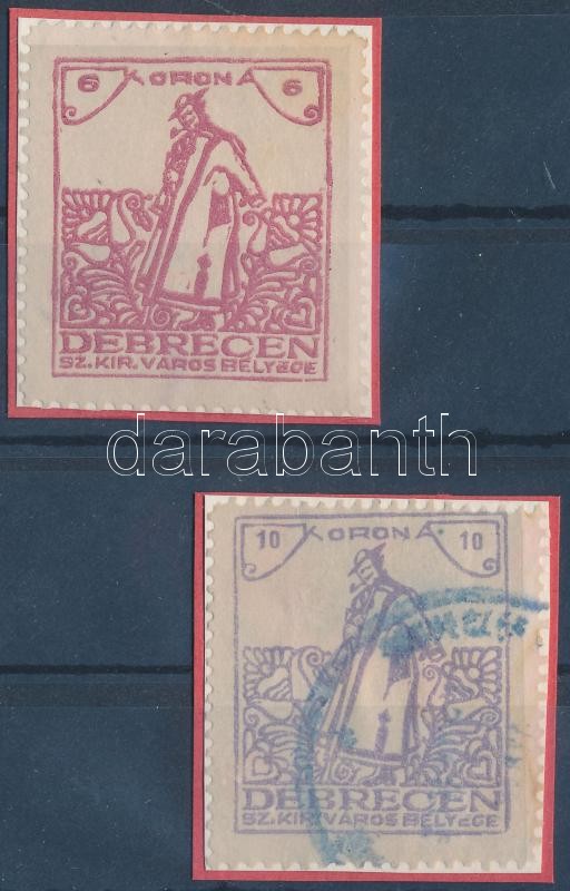 Leírás: 1919 Debrecen SZ.KIR.V. 2 féle 4 oldalon fogazott okirati illetékbélyeg (3.900)