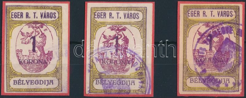 Leírás: 1920 Eger R.T.V. 3 db 2 féle okirati illetékbélyeg (7.500)