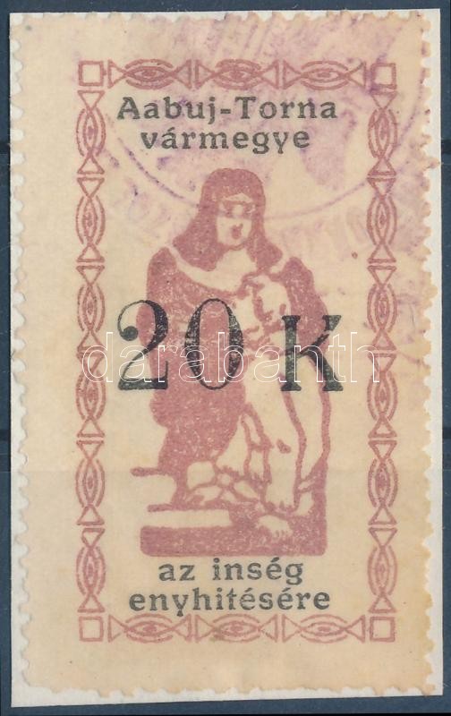 1923 Abaúj-Torna vármegyei ínségbélyeg 20K felcserélt betűkkel, négy o... https://www.darabanth.com/hu/302-Gyorsarveres/302.0/Festmeny-mutargy-papirregiseg-egyeb/Okmanybelyegek~16/1923-Abauj-Torna-varmegyei-insegbelyeg-20K-felcserelt-betukkel-negy-oldalon-fogazott-6600~II1623395