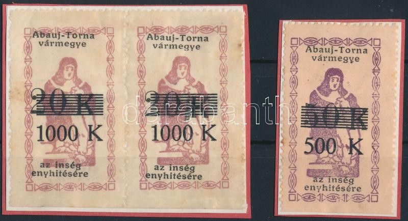 Leírás: 1924 Abaúj-Torna vármegyei ínségbélyeg 500K/50K és 1000K/20K párban (9.000)