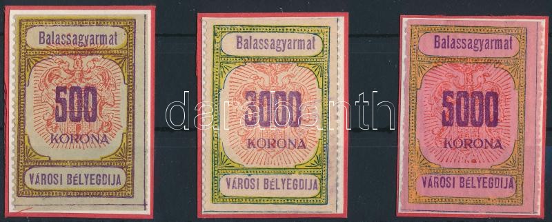 Leírás: 1924 Balassagyarmat városi bélyegdíj 1, 5 és 6 sz. okmánybélyege (14.000)