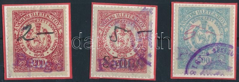 Leírás: 1927 Békéscsaba városi illetékbélyeg 3 klf felülbélyegzett példánya (8.500)