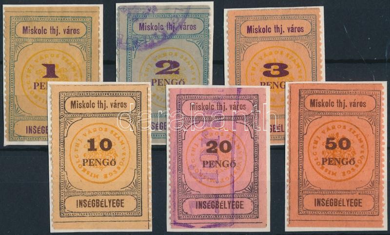 Leírás: 1945 Miskolc thjf. városi ínségbélyeg 6 klf érték (14.000)