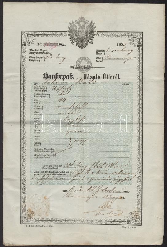 1850 Házaló útlevél sok pecséttel / Peddler passport https://www.darabanth.com/hu/302-Gyorsarveres/302.0/Festmeny-mutargy-papirregiseg-egyeb/Okmanyok~17/1850-Hazalo-utlevel-sok-pecsettel-Peddler-passport~II1626005